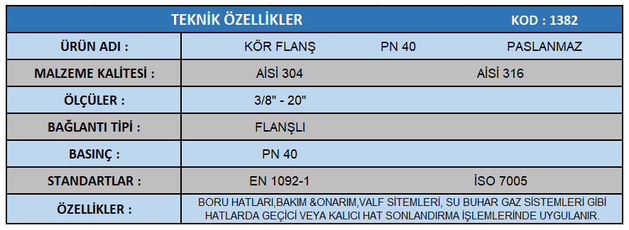 KÖR FLANŞ PN40 -PASLANMAZ